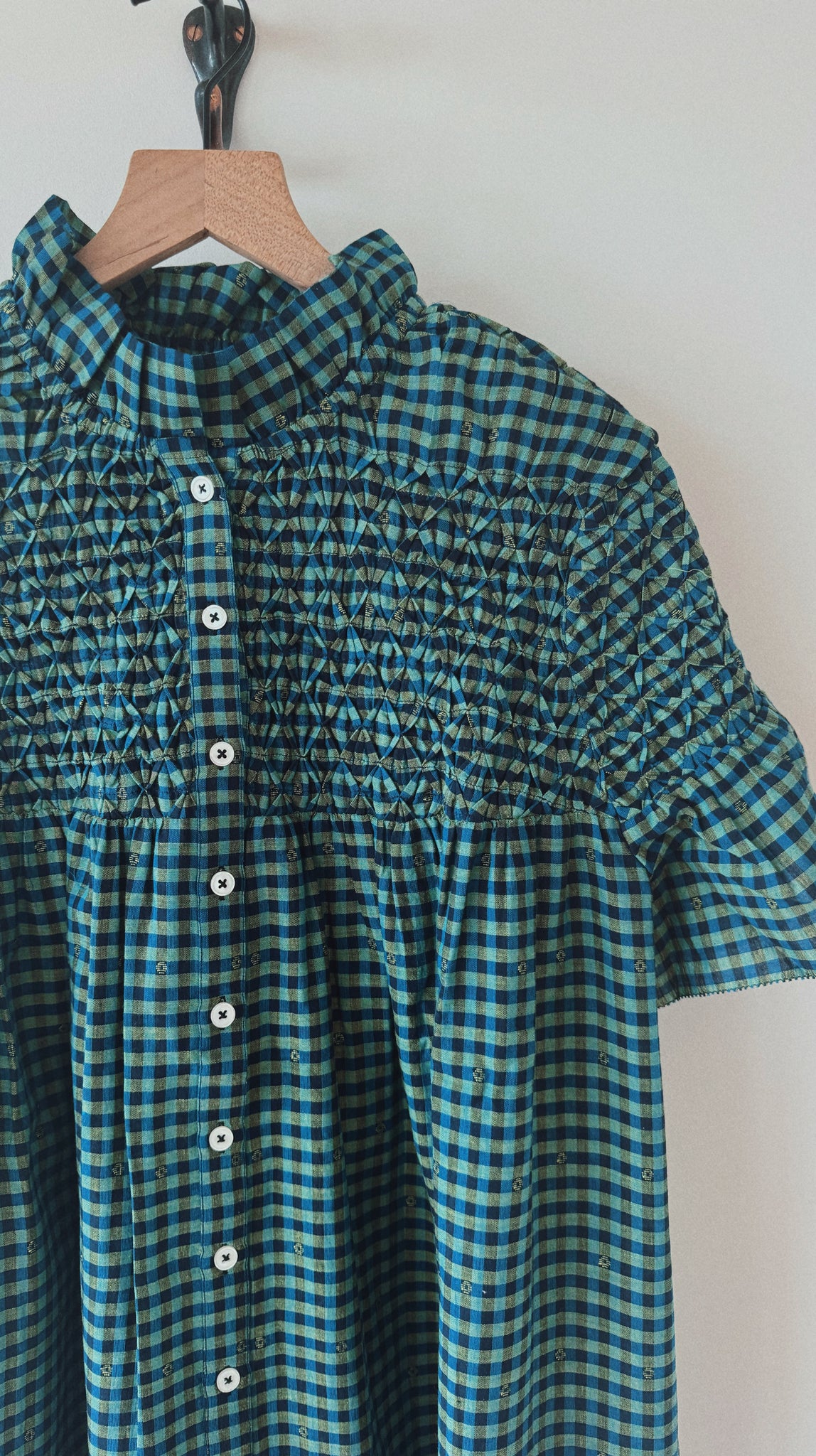 Our signature diamond smocked maxi dress with button front closure and ruffle collar.