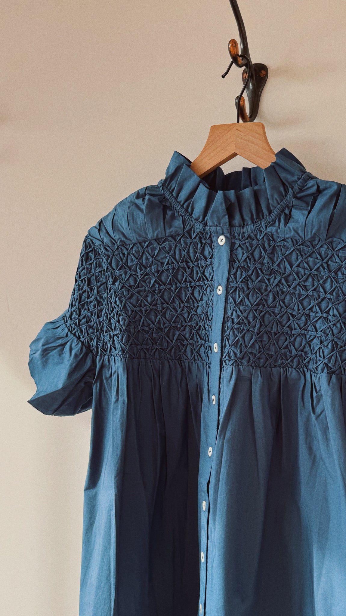 Our signature diamond smocked blouse with button closure and ruffle collar.